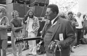 Stanley Johnston (CSNY producer), Robin Williams, and Neil Young watching BB King walk past them on his way to stage